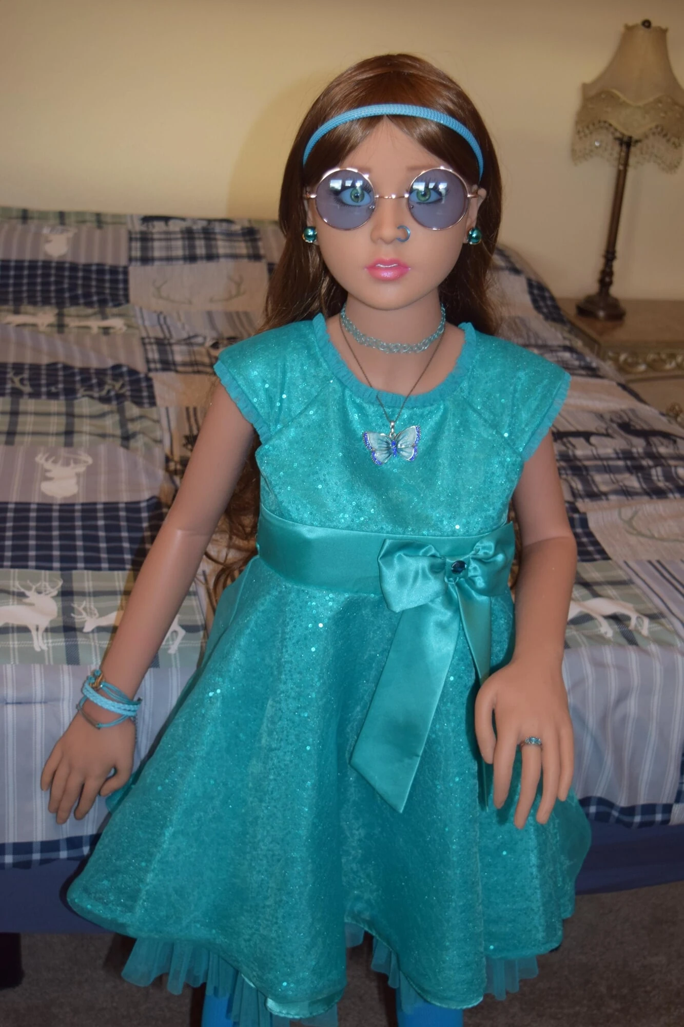 She weighs 54# and is 140cm tall. She is made of TPE, with a metal skeleton. After a corn starch massage she feels amazing and I can barely keep my hands off her to snap some shots. Especially after I get her all dressed up!